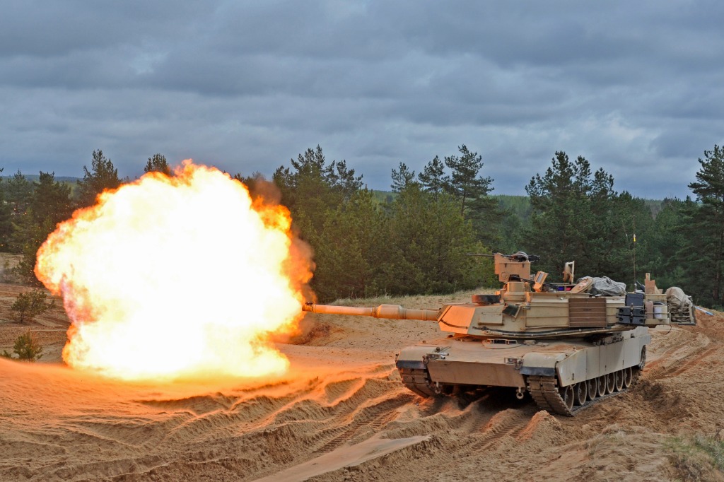 2015年5月7日,在拉脫維亞阿達(dá)日軍事基地靶場,一輛美軍“艾布拉姆斯”M1A2主戰(zhàn)坦克進(jìn)行實(shí)彈射擊訓(xùn)練。新華社記者郭群攝