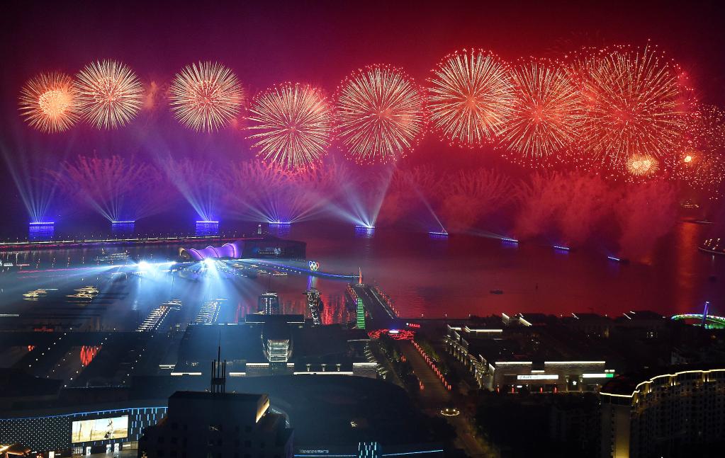 這是上合組織青島峰會期間舉行的《有朋自遠(yuǎn)方來》燈光焰火藝術(shù)表演。新華社記者 李紫恒 攝
