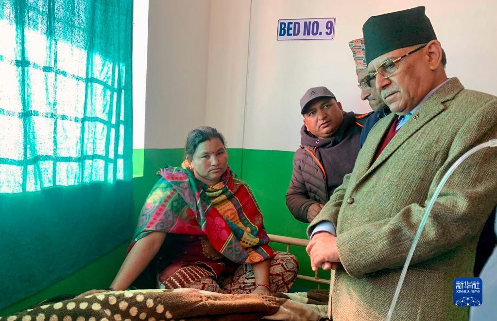 11月4日,在尼泊爾西部扎澤爾果德,尼泊爾總理普拉昌達(dá)(右)在醫(yī)院看望受傷民眾。新華社發(fā)(尼泊爾總理府供圖)