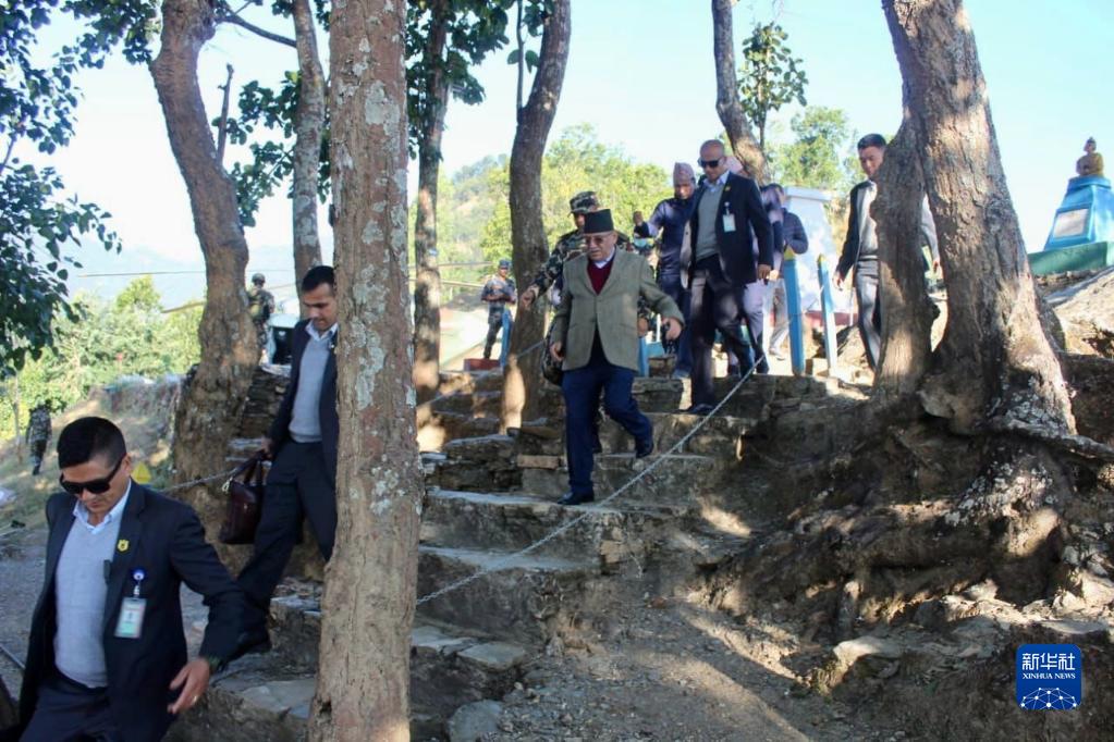 11月4日,在尼泊爾西部扎澤爾果德,尼泊爾總理普拉昌達(dá)(中)抵達(dá)災(zāi)區(qū)。新華社發(fā)(尼泊爾總理府供圖)