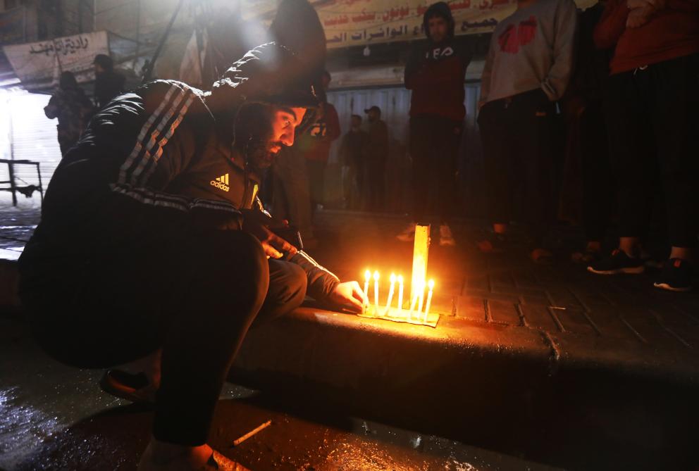 2月8日凌晨,一名男子在伊拉克首都巴格達的無人機襲擊事件現(xiàn)場點燃蠟燭悼念遇難者。 新華社發(fā)(哈利勒·達伍德攝)