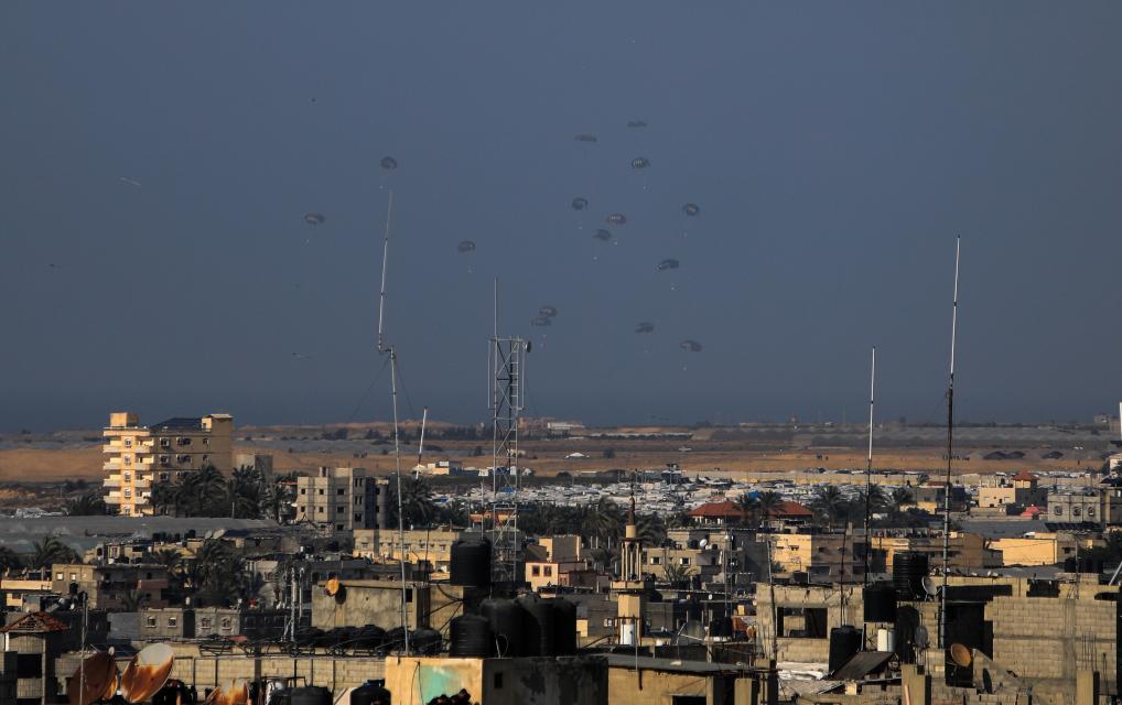 這是2月27日拍攝的向加沙地帶空投的救援物資。約旦武裝部隊(duì)27日發(fā)表聲明說,約旦皇家空軍當(dāng)天向巴勒斯坦加沙地帶空投了一批救援物資。聲明說,3架約旦皇家空軍的飛機(jī)和3架分別來自阿拉伯聯(lián)合酋長國、埃及和法國的飛機(jī)當(dāng)天從位于約旦首都安曼的阿卜杜拉二世空軍基地起飛,執(zhí)行向加沙地帶空投救援物資和食品的任務(wù)。新華社發(fā)(亞西爾·庫迪攝)