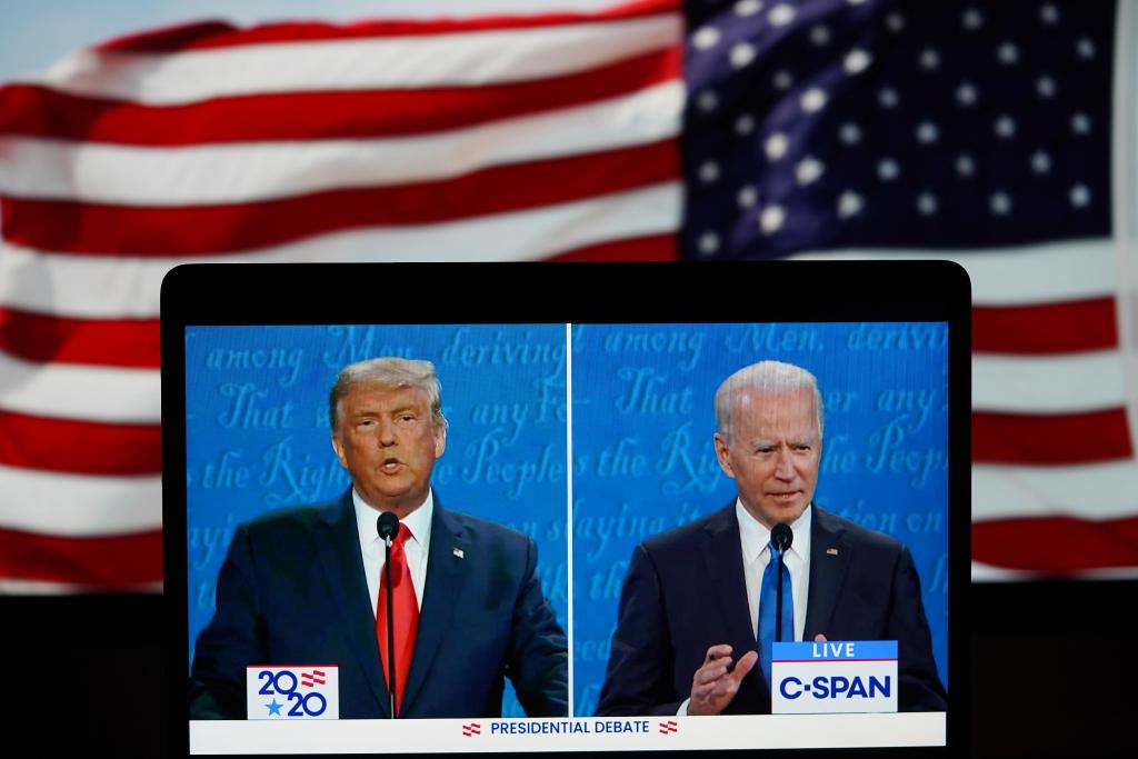 這張2020年10月22日在美國弗吉尼亞州阿靈頓拍攝的視頻畫面顯示,時任美國總統(tǒng)特朗普(左)與當時的民主黨總統(tǒng)候選人拜登在田納西州納什維爾市參加最后一場總統(tǒng)候選人電視辯論。新華社記者劉杰攝