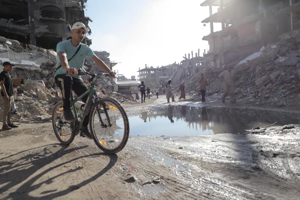 9月9日,一名男子在加沙地帶北部杰巴利耶難民營(yíng)騎行。新華社發(fā)(阿卜杜勒拉赫曼·薩拉馬攝)