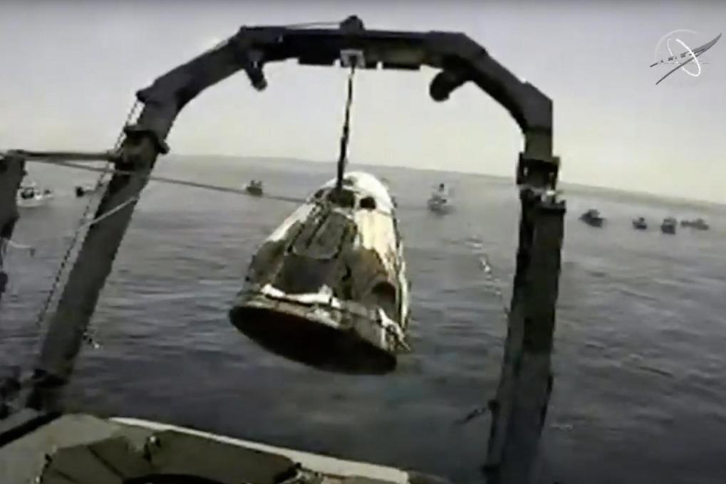 這張美國航天局2020年8月2日發(fā)布的視頻截圖顯示,回收船在美國東南部佛羅里達(dá)州附近的墨西哥灣打撈太空探索技術(shù)公司“龍”飛船。新華社發(fā)(美國航天局供圖)