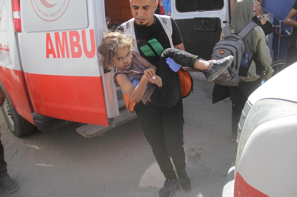 10月21日,在加沙地帶北部謝赫拉德萬的醫(yī)院,一名男子抱著受傷的孩子。新華社發(fā)(馬哈茂德·扎基攝)