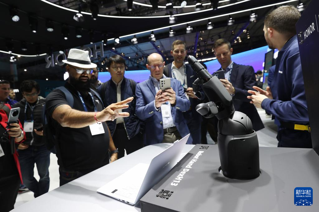 3月3日,在西班牙巴塞羅那舉行的2025年世界移動通信大會上,參觀者與多維觸覺靈巧手互動。新華社記者 趙丁喆 攝