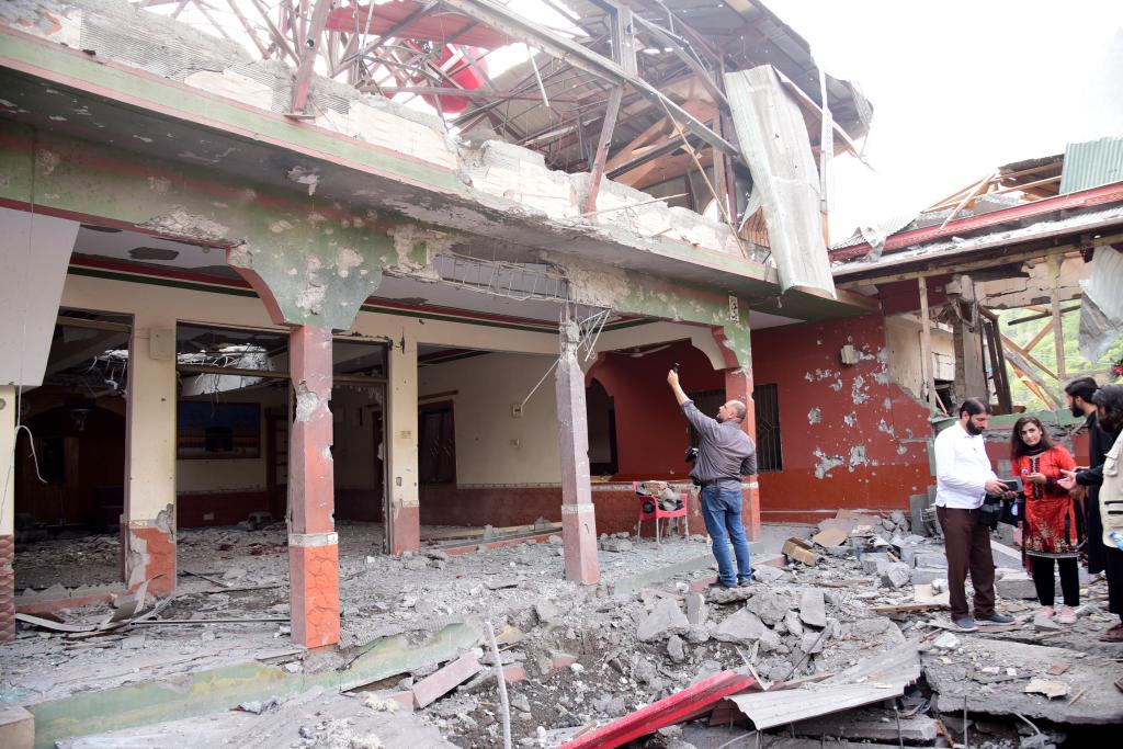 5月7日,在巴控克什米爾地區(qū)首府穆扎法拉巴德,人們在一幢遭印度空襲的建筑內(nèi)查看損失情況。新華社發(fā)(穆罕默德·丁·穆加爾攝)