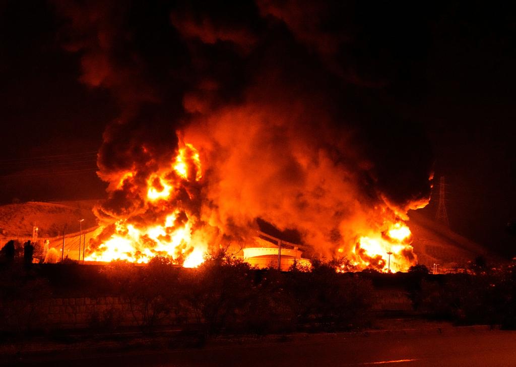 這是6月15日凌晨拍攝的伊朗首都德黑蘭附近遭以色列襲擊起火的儲油設(shè)施。新華社/美聯(lián)