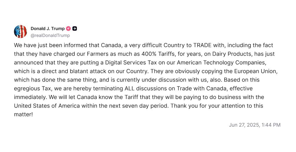 特朗普在“真實(shí)社交”上發(fā)文說(shuō):“我們剛剛得知,加拿大宣布要對(duì)美國(guó)技術(shù)公司征收數(shù)字服務(wù)稅,這是公然對(duì)我們國(guó)家進(jìn)行直接攻擊!