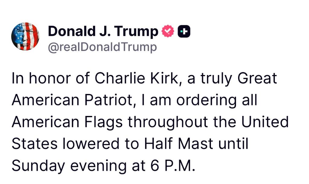 特朗普連發(fā)3條帖文下令全國降半旗志哀,直至14日傍晚6時。