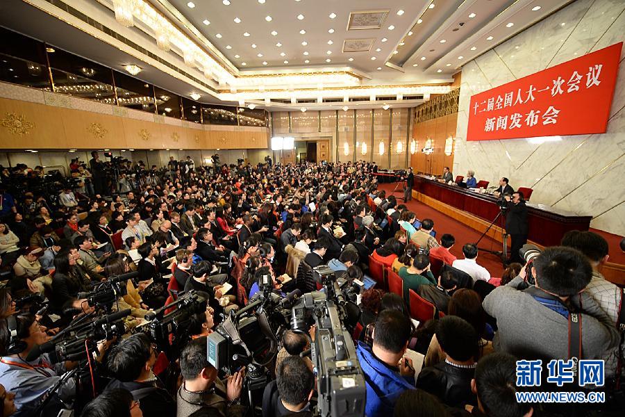 [主持人]現(xiàn)在,大會(huì)新聞發(fā)言人傅瑩已經(jīng)來到現(xiàn)場。全國人大十二屆一次會(huì)議新聞發(fā)布會(huì)馬上開始。