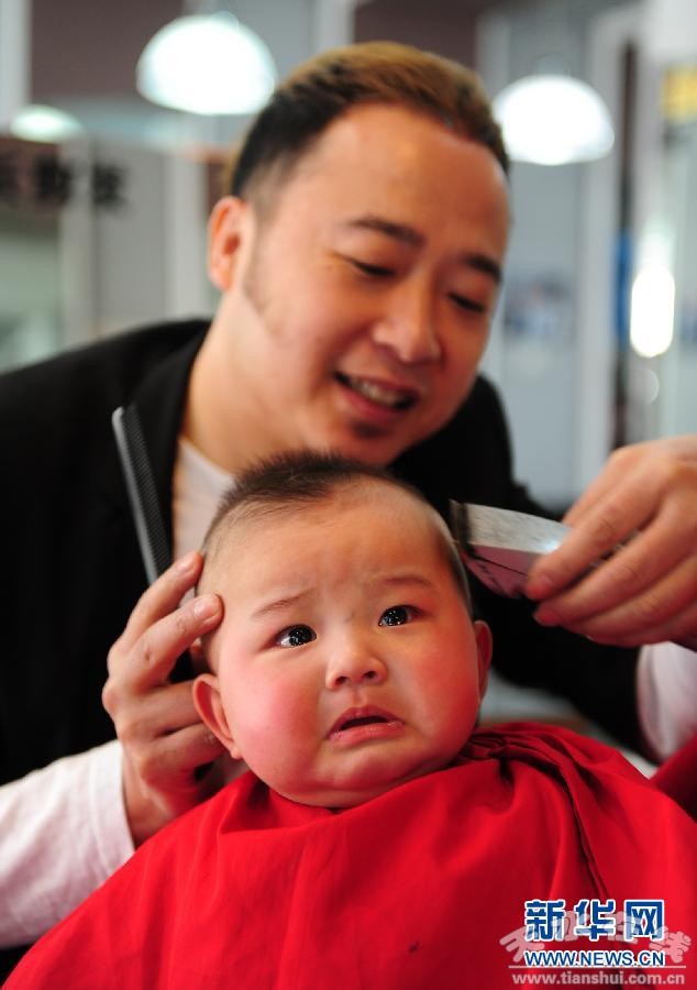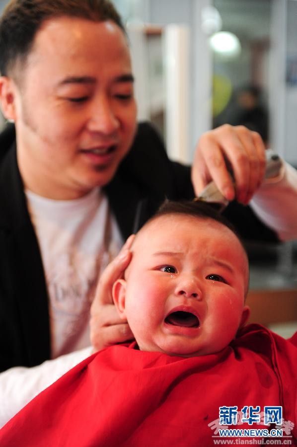 3月13日,在山東省煙臺(tái)市一家理發(fā)店,理發(fā)師為出生5個(gè)月的小朋友曲泳豪“剃龍頭”。當(dāng)日是農(nóng)歷二月初二,我國(guó)民間有“二月二,剃龍頭”的傳統(tǒng)習(xí)俗。人們?cè)谶@天剃頭,期盼新年新氣象,交上好運(yùn)氣。新華社發(fā)(初陽(yáng) 攝)