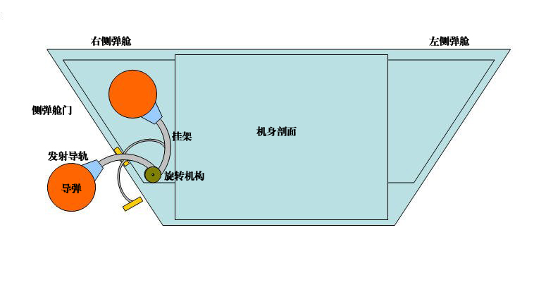 一些分析人士制作的殲-20戰(zhàn)斗機側(cè)彈艙結(jié)構(gòu)示意圖:這個結(jié)構(gòu)非常簡單,只需要一個旋轉(zhuǎn)機構(gòu)和一個液壓作動筒,就完成了全部發(fā)射動作,如圖所示,新型格斗導彈被安裝在一個旋轉(zhuǎn)機構(gòu)的掛架上,當導彈發(fā)射時,側(cè)彈艙艙門打開,導彈掛架被旋轉(zhuǎn)機構(gòu)轉(zhuǎn)出艙外,然后側(cè)彈艙艙門關(guān)閉,導彈在掛架上發(fā)射。(圖片來源:超大軍事)