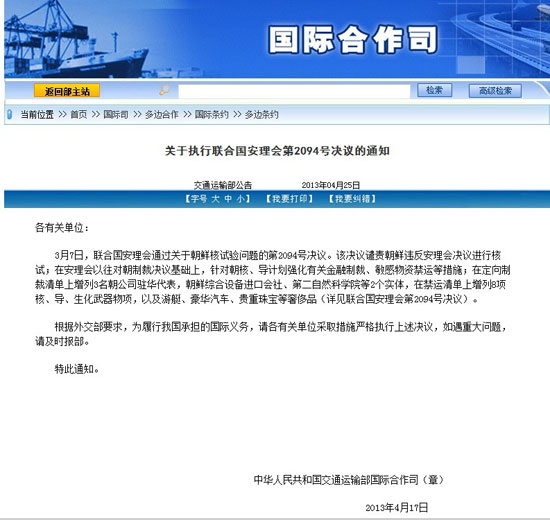 3月7日,聯(lián)合國(guó)安理會(huì)通過(guò)關(guān)于朝鮮核試驗(yàn)問(wèn)題的第2094號(hào)決議。該決議譴責(zé)朝鮮違反安理會(huì)決議進(jìn)行核試;在安理會(huì)以往對(duì)朝制裁決議基礎(chǔ)上,針對(duì)朝核、導(dǎo)計(jì)劃強(qiáng)化有關(guān)金融制裁、敏感物資禁運(yùn)等措施;在定向制裁清單上增列3名朝公司駐華代表,朝鮮綜合設(shè)備進(jìn)口會(huì)社、第二自然科學(xué)院等2個(gè)實(shí)體,在禁運(yùn)清單上增列8項(xiàng)核、導(dǎo)、生化武器物項(xiàng),以及游艇、豪華汽車(chē)、貴重珠寶等奢侈品(詳見(jiàn)聯(lián)合國(guó)安理會(huì)第2094號(hào)決議)。