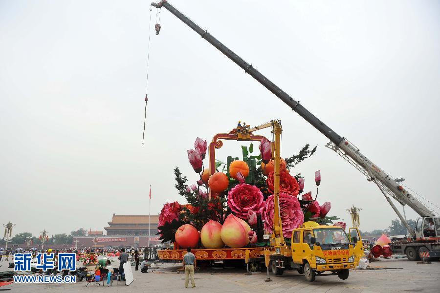 9月22日,施工人員在北京天安門廣場安裝“花果籃”。北京天安門廣場國慶花壇搭建工作目前正在進行。 新華社記者 陳曄華 攝