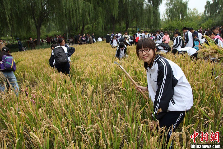 北京清華附中組織學(xué)生收割稻穗 體驗(yàn)勞作辛苦(圖)