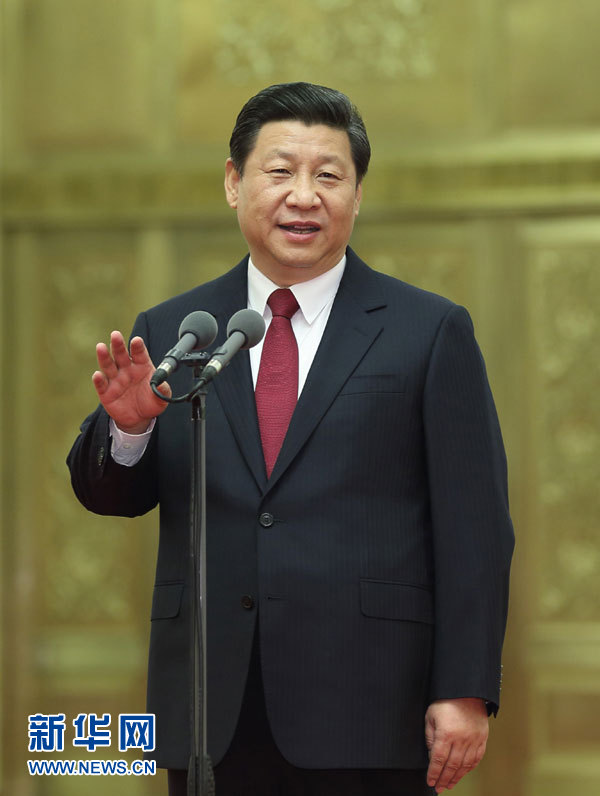 1月6日,黨和國家領(lǐng)導(dǎo)人習(xí)近平、李克強(qiáng)、張德江、俞正聲、劉云山、王岐山、張高麗等在北京人民大會(huì)堂會(huì)見探月工程嫦娥三號(hào)任務(wù)參研參試人員代表。這是習(xí)近平發(fā)表重要講話。新華社記者 蘭紅光 攝