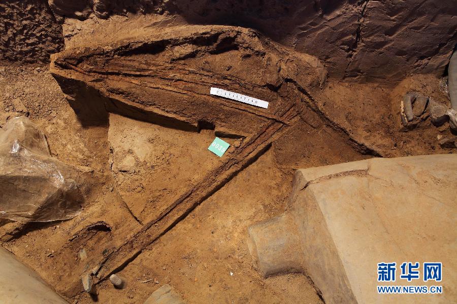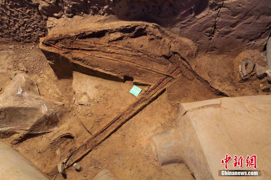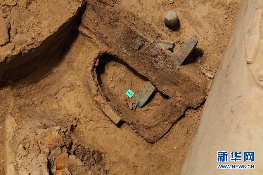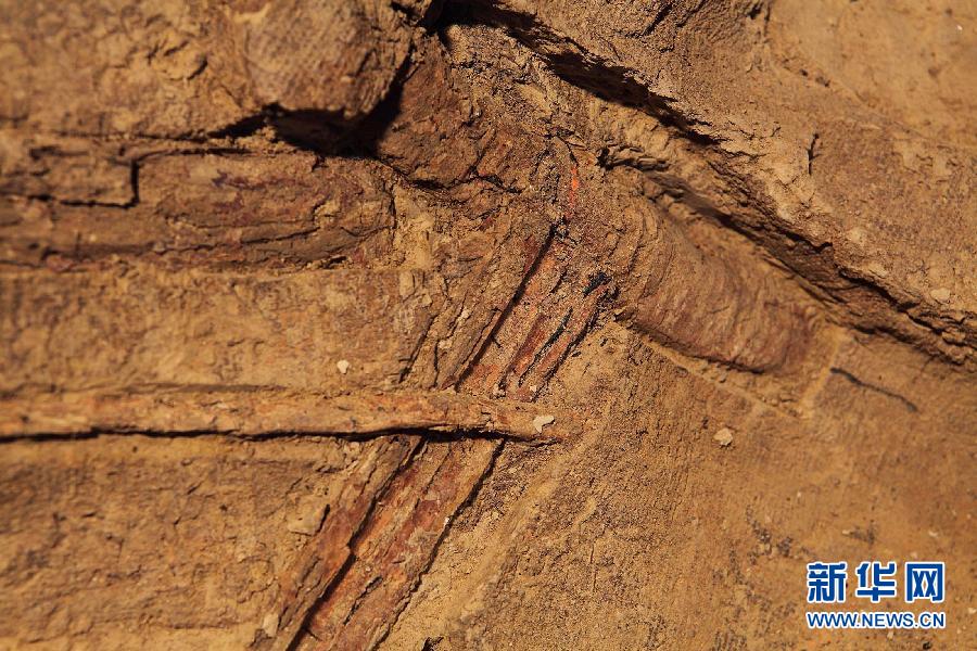 這是秦兵馬俑一號坑出土的弓弩,其弩機部分清晰可見(2013年12月10日攝)。2月26日,記者從秦始皇帝陵博物院獲悉,考古專家在對秦兵馬俑一號坑進行第三次考古發(fā)掘過程中,在靠近坑壁北沿的過洞中清理發(fā)現(xiàn)了一件弓弩,其最易損毀的弓弦清晰可見,整體保存較完整,這在秦兵馬俑考古史上尚屬首次。新華社發(fā)