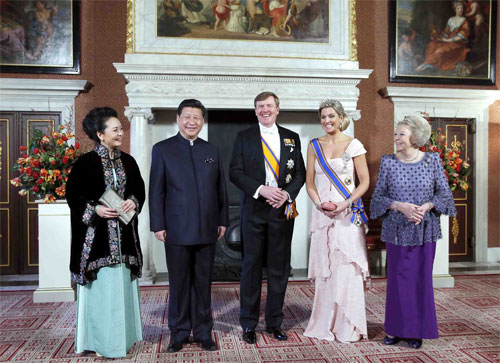 22日,古老的阿姆斯特丹王宮,荷蘭國王“白領(lǐng)結(jié)”盛裝宴會,歐洲王室最高規(guī)格禮遇。中國國家主席習(xí)近平和夫人彭麗媛,特色鮮明的中式服裝,獨(dú)特的中華文化風(fēng)采。