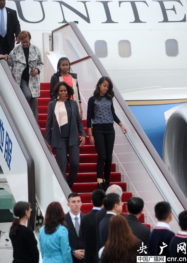 2014年03月24日,四川省成都市,下午18:50,米歇爾一行抵達(dá)成都雙流國際機場,開始對成都市的友好訪問。米歇爾和女兒對成都小朋友送給她們的大熊貓玩偶愛不釋手。