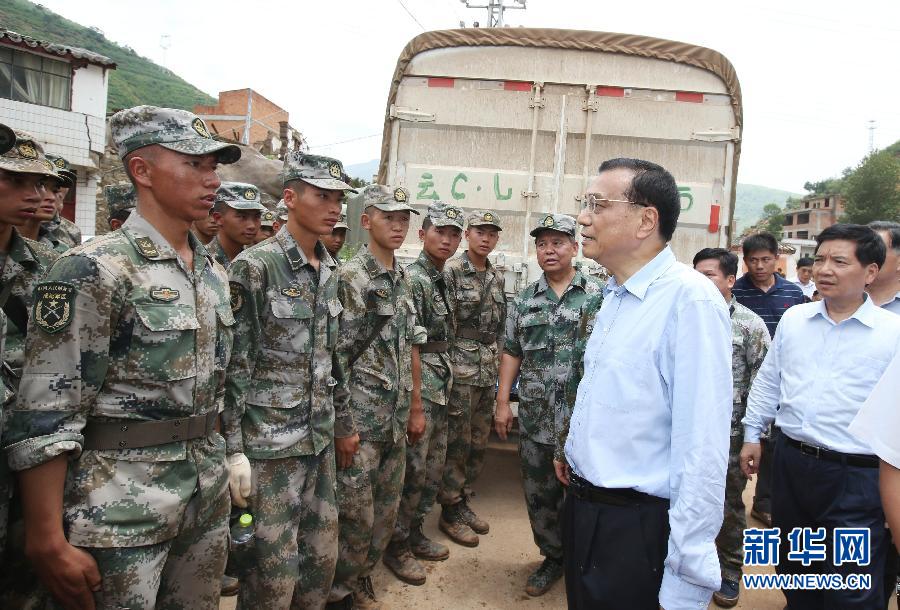 8月3日下午4時(shí)30分,云南省魯?shù)榭h發(fā)生6.5級(jí)地震。黨中央、國(guó)務(wù)院高度重視,中共中央總書記、國(guó)家主席、中央軍委主席習(xí)近平和中共中央政治局常委、國(guó)務(wù)院總理李克強(qiáng)立即作出重要指示和批示。4日一早,李克強(qiáng)代表黨中央、國(guó)務(wù)院,代表習(xí)近平總書記急飛災(zāi)區(qū)察看災(zāi)情,現(xiàn)場(chǎng)指揮抗震救災(zāi)工作。一上飛機(jī),李克強(qiáng)就召開緊急會(huì)議,聽取匯報(bào),詳細(xì)了解災(zāi)情、群眾傷亡和救援進(jìn)展,部署救災(zāi)工作。飛抵地震災(zāi)區(qū)后,李克強(qiáng)即乘車趕往此次地震的震中魯?shù)榭h龍頭山鎮(zhèn),并徒步5公里多來(lái)到受災(zāi)最嚴(yán)重的龍泉村,實(shí)地察看災(zāi)情。隨后,李克強(qiáng)在鎮(zhèn)中學(xué)操場(chǎng)上的帳篷里召開現(xiàn)場(chǎng)會(huì),協(xié)調(diào)解決抗震救災(zāi)中的問(wèn)題。入夜,李克強(qiáng)又忙著到庫(kù)房察看救災(zāi)物資的儲(chǔ)備、配發(fā)等情況,并細(xì)心地叮囑司機(jī)爭(zhēng)分奪秒運(yùn)輸?shù)耐瑫r(shí)要確保安全。次日一大早,他來(lái)到魯?shù)榭h人民醫(yī)院,看望這里收治的地震傷員,慰問(wèn)醫(yī)護(hù)人員。兩天時(shí)間里,地震災(zāi)區(qū)留下了總理忙碌的身影。這是8月4日,李克強(qiáng)在震中龍頭山鎮(zhèn)與抗震救災(zāi)的官兵交談。 新華社記者姚大偉攝