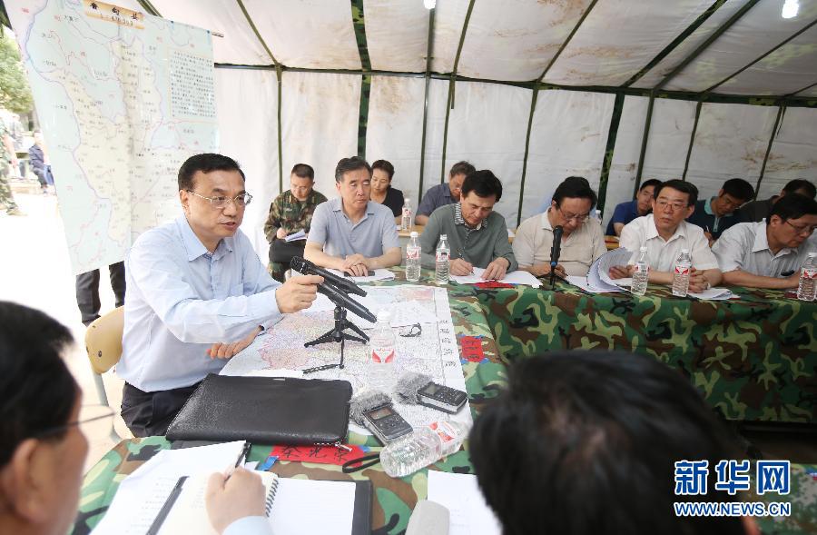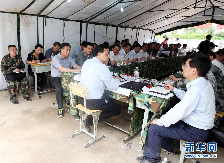 8月3日下午4時(shí)30分,云南省魯?shù)榭h發(fā)生6.5級(jí)地震。黨中央、國(guó)務(wù)院高度重視,中共中央總書記、國(guó)家主席、中央軍委主席習(xí)近平和中共中央政治局常委、國(guó)務(wù)院總理李克強(qiáng)立即作出重要指示和批示。4日一早,李克強(qiáng)代表黨中央、國(guó)務(wù)院,代表習(xí)近平總書記急飛災(zāi)區(qū)察看災(zāi)情,現(xiàn)場(chǎng)指揮抗震救災(zāi)工作。一上飛機(jī),李克強(qiáng)就召開緊急會(huì)議,聽取匯報(bào),詳細(xì)了解災(zāi)情、群眾傷亡和救援進(jìn)展,部署救災(zāi)工作。飛抵地震災(zāi)區(qū)后,李克強(qiáng)即乘車趕往此次地震的震中魯?shù)榭h龍頭山鎮(zhèn),并徒步5公里多來(lái)到受災(zāi)最嚴(yán)重的龍泉村,實(shí)地察看災(zāi)情。隨后,李克強(qiáng)在鎮(zhèn)中學(xué)操場(chǎng)上的帳篷里召開現(xiàn)場(chǎng)會(huì),協(xié)調(diào)解決抗震救災(zāi)中的問(wèn)題。入夜,李克強(qiáng)又忙著到庫(kù)房察看救災(zāi)物資的儲(chǔ)備、配發(fā)等情況,并細(xì)心地叮囑司機(jī)爭(zhēng)分奪秒運(yùn)輸?shù)耐瑫r(shí)要確保安全。次日一大早,他來(lái)到魯?shù)榭h人民醫(yī)院,看望這里收治的地震傷員,慰問(wèn)醫(yī)護(hù)人員。兩天時(shí)間里,地震災(zāi)區(qū)留下了總理忙碌的身影。這是8月4日,李克強(qiáng)在震中龍頭山鎮(zhèn)中學(xué)操場(chǎng)上的帳篷里召開現(xiàn)場(chǎng)會(huì),協(xié)調(diào)解決抗震救災(zāi)中的問(wèn)題。 新華社記者姚大偉攝