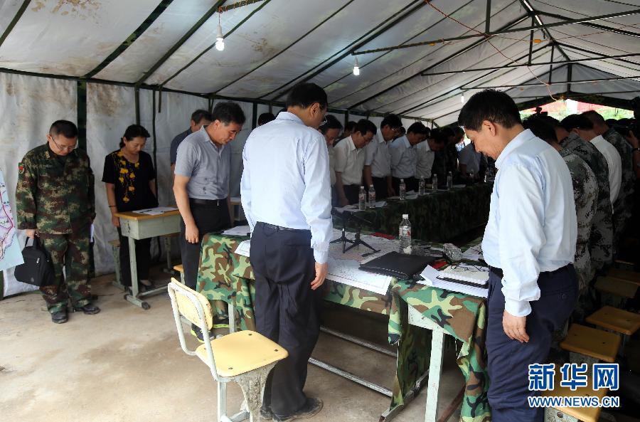 8月3日下午4時(shí)30分,云南省魯?shù)榭h發(fā)生6.5級(jí)地震。黨中央、國(guó)務(wù)院高度重視,中共中央總書記、國(guó)家主席、中央軍委主席習(xí)近平和中共中央政治局常委、國(guó)務(wù)院總理李克強(qiáng)立即作出重要指示和批示。4日一早,李克強(qiáng)代表黨中央、國(guó)務(wù)院,代表習(xí)近平總書記急飛災(zāi)區(qū)察看災(zāi)情,現(xiàn)場(chǎng)指揮抗震救災(zāi)工作。一上飛機(jī),李克強(qiáng)就召開緊急會(huì)議,聽取匯報(bào),詳細(xì)了解災(zāi)情、群眾傷亡和救援進(jìn)展,部署救災(zāi)工作。飛抵地震災(zāi)區(qū)后,李克強(qiáng)即乘車趕往此次地震的震中魯?shù)榭h龍頭山鎮(zhèn),并徒步5公里多來(lái)到受災(zāi)最嚴(yán)重的龍泉村,實(shí)地察看災(zāi)情。隨后,李克強(qiáng)在鎮(zhèn)中學(xué)操場(chǎng)上的帳篷里召開現(xiàn)場(chǎng)會(huì),協(xié)調(diào)解決抗震救災(zāi)中的問(wèn)題。入夜,李克強(qiáng)又忙著到庫(kù)房察看救災(zāi)物資的儲(chǔ)備、配發(fā)等情況,并細(xì)心地叮囑司機(jī)爭(zhēng)分奪秒運(yùn)輸?shù)耐瑫r(shí)要確保安全。次日一大早,他來(lái)到魯?shù)榭h人民醫(yī)院,看望這里收治的地震傷員,慰問(wèn)醫(yī)護(hù)人員。兩天時(shí)間里,地震災(zāi)區(qū)留下了總理忙碌的身影。這是8月4日,李克強(qiáng)在震中龍頭山鎮(zhèn)中學(xué)操場(chǎng)上的帳篷里召開現(xiàn)場(chǎng)會(huì),協(xié)調(diào)解決抗震救災(zāi)中的問(wèn)題。會(huì)議開始時(shí),李克強(qiáng)和參加會(huì)議的全體同志向此次地震中的不幸遇難者默哀。新華社記者姚大偉攝