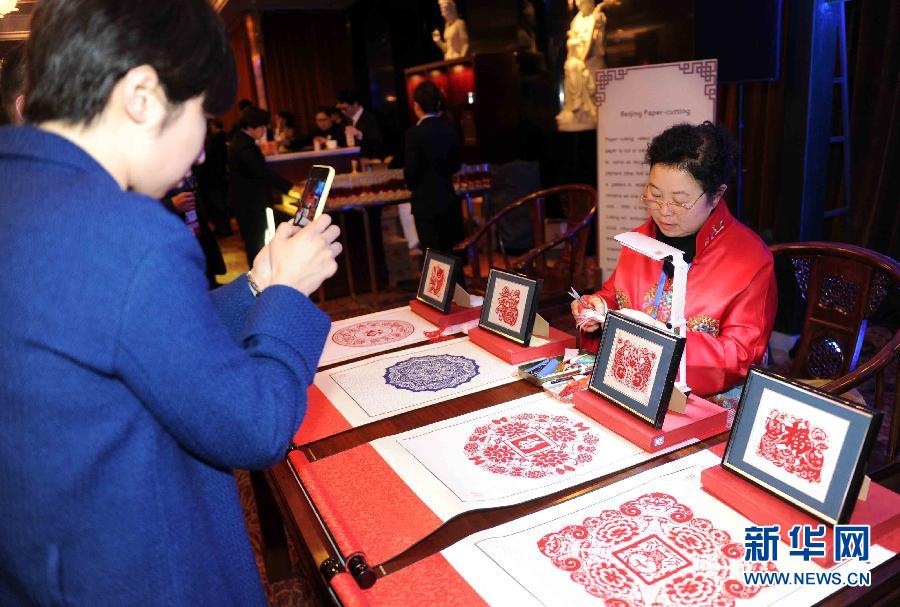 11月8日,嘉賓在欣賞剪紙作品的制作展示。當(dāng)日,北京市人民政府和2014年APEC工商領(lǐng)導(dǎo)人峰會組委會等共同舉辦“APEC工商之夜”,2014年APEC工商領(lǐng)導(dǎo)人峰會參會代表等1200余人出席。新華社記者 公磊 攝