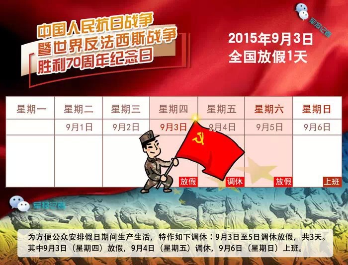 今天,國務(wù)院發(fā)布消息,中國人民抗日戰(zhàn)爭暨世界反法西斯戰(zhàn)爭勝利70周年紀(jì)念日調(diào)休放假,2015年9月3日全國放假1天。具體安排:9月3日至5日調(diào)休放假,共3天。其中9月3日(星期四)放假,9月4日(星期五)調(diào)休,9月6日(星期日)上班。