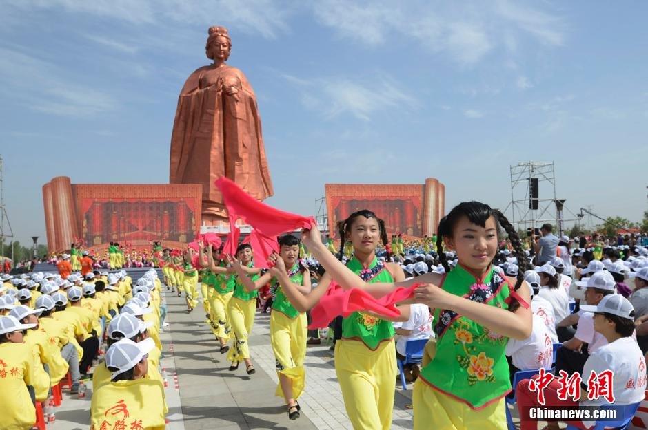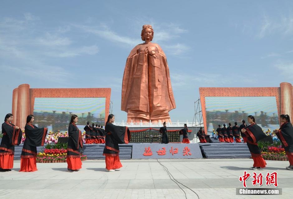 5月17日,山西省晉中市太谷縣,民眾瞻仰巨型孟母銅像。