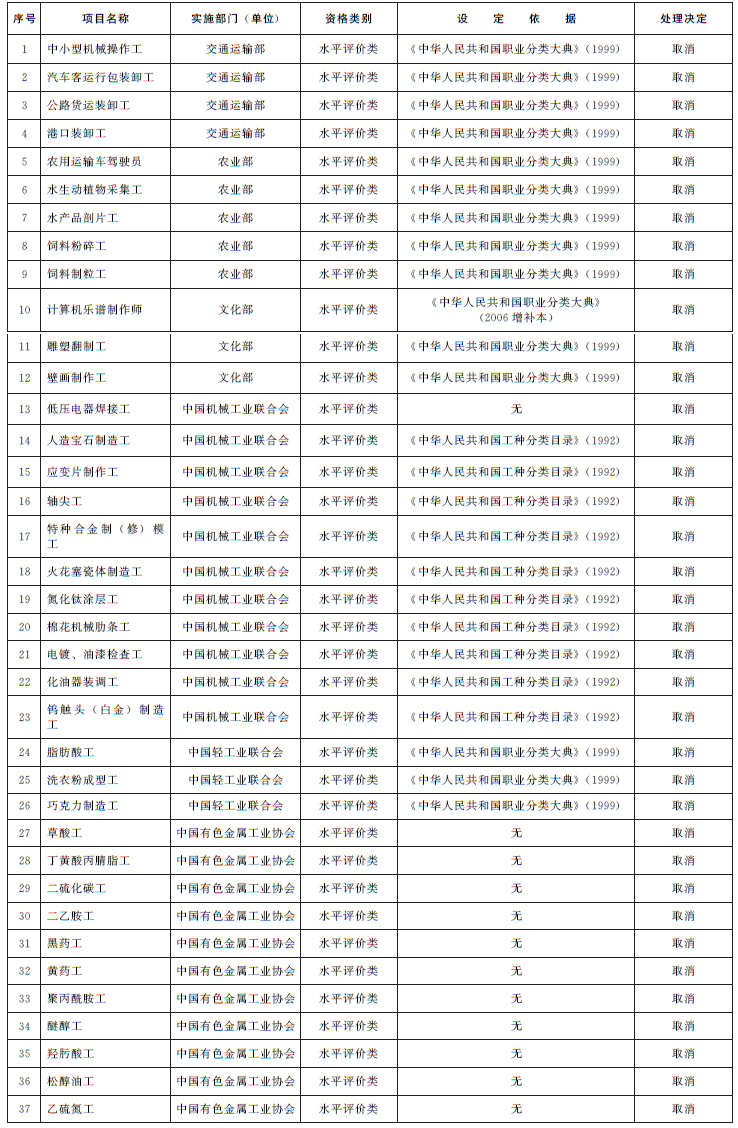 二、取消的技能人員職業(yè)資格許可和認定事項 (共計37項,均為水平評價類)