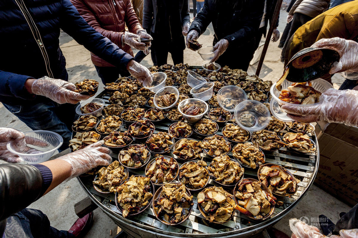 2016年2月25日,河南省濮陽(yáng)縣五星鄉(xiāng)瑕丘村,方圓百里的2000余名群眾同吃“一鍋飯”,拜祭中華人文始祖舜帝。當(dāng)日是農(nóng)歷正月十八,相傳為舜帝的生日。每年的這天,無論天氣如何,當(dāng)?shù)胤綀A百里的人們都要云集五星鄉(xiāng)瑕丘。瑕丘廟會(huì)也因此而發(fā)展成為中原地帶傳統(tǒng)的各族群眾大集合、求和諧的民俗活動(dòng),千百年來久盛不衰。王子瑞/視覺中國(guó)