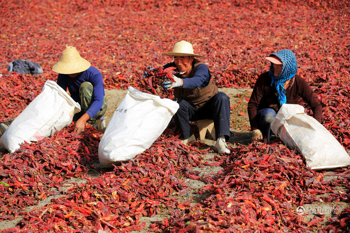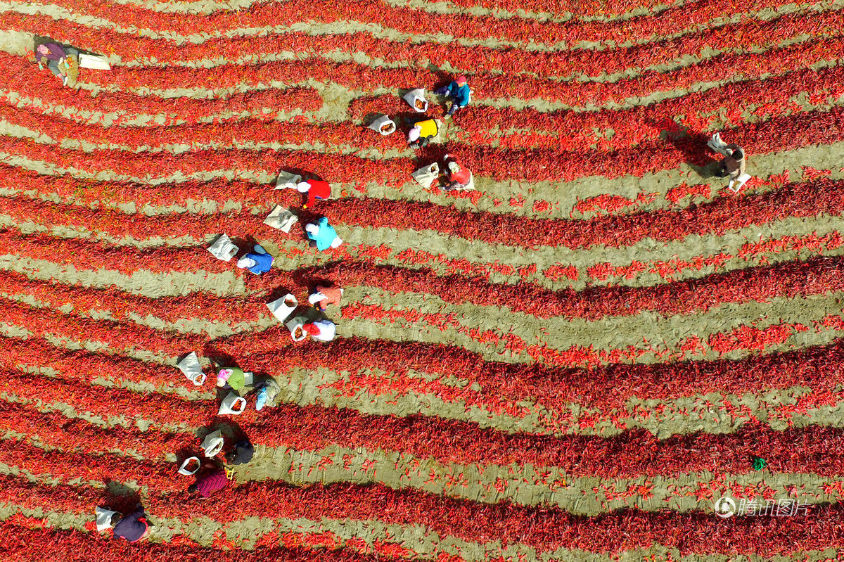 10月10日,在新疆博湖縣烏蘭再格森鄉(xiāng)烏蘭再格森村的晾曬場上,椒農(nóng)正在對豐收的辣椒進(jìn)行集中晾曬、分揀、裝袋。每年深秋時(shí)節(jié),素有“辣椒之鄉(xiāng)”新疆博湖縣又迎來了一個(gè)滿滿豐收季,火紅的辣椒鋪滿了整個(gè)晾曬場,在一望無際的金秋田野上顯得十分耀眼。年磊/視覺中國