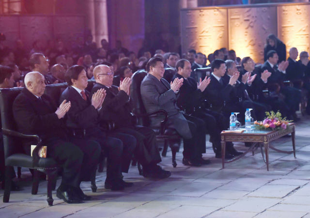 1月21日,國(guó)家主席習(xí)近平和埃及總統(tǒng)塞西在古老的盧克索神廟廣場(chǎng)共同出席中埃建交60周年慶祝活動(dòng)暨2016中埃文化年開(kāi)幕式。(新華社記者張鐸攝)