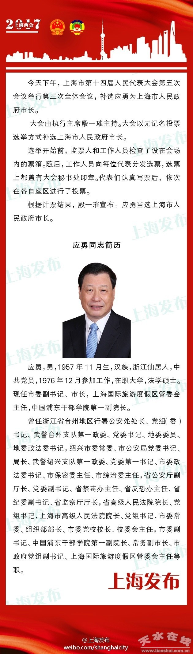 【應(yīng)勇當選上海市市長】#最新#上海市第十四屆人民代表大會第五次會議今天下午舉行第三次全體會議,補選應(yīng)勇為上海市人民政府市長。