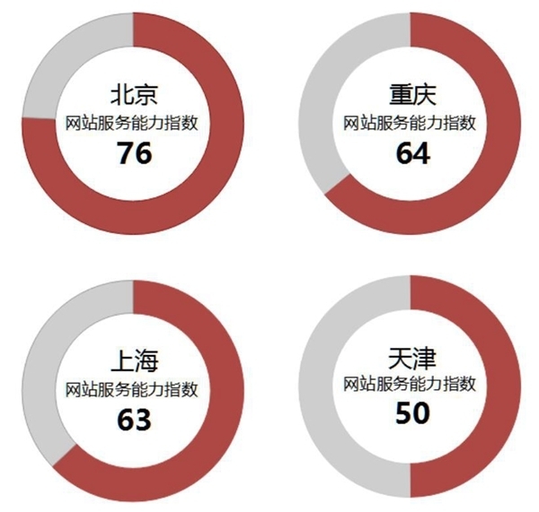 在四個(gè)直轄市中,北京市門戶網(wǎng)站的服務(wù)能力位列第一,在信息發(fā)布和網(wǎng)上辦事能力上成效顯著,網(wǎng)站便捷易用,且穩(wěn)定可靠。重慶市和上海市分列二、三位,針對(duì)用戶反饋的回應(yīng)和處理效率值得肯定。