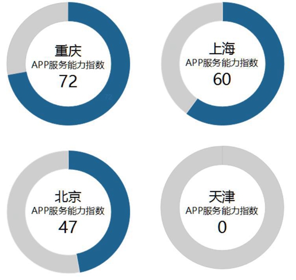 四個(gè)直轄市中,重慶市的政務(wù)APP服務(wù)能力超越北京、上海位列第一,該市的政務(wù)APP不僅功能全面、信息完備,而且符合用戶的使用習(xí)慣。上海市和北京市分列二、三位,其提供信息的豐富度和APP使用體驗(yàn)的反饋機(jī)制稍顯遜色,截至測(cè)評(píng)時(shí)天津市尚未開(kāi)通政務(wù)APP服務(wù)渠道。