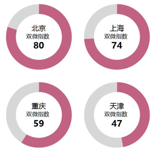 “雙微”指數(shù)是用來(lái)比較衡量政府官方微信、微博活躍度和服務(wù)提供效能的重要指標(biāo)。從整體來(lái)看,四直轄市微博和微信的服務(wù)能力情況呈現(xiàn)一定的正相關(guān)性,但微博的情況整體好于微信。比較而言,北京和上海市“雙微”服務(wù)能力指數(shù)較高,天津市在“雙微”渠道的應(yīng)用上落后于其他三市。
