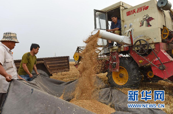 6月2日,河北省巨鹿縣柳林村的農(nóng)民在收獲小麥。近期,河北省小麥由南至北陸續(xù)成熟,農(nóng)民開始適時收割小麥。據(jù)了解,2017年河北省小麥收獲面積預計達3400多萬畝。 新華社記者 楊世堯攝
