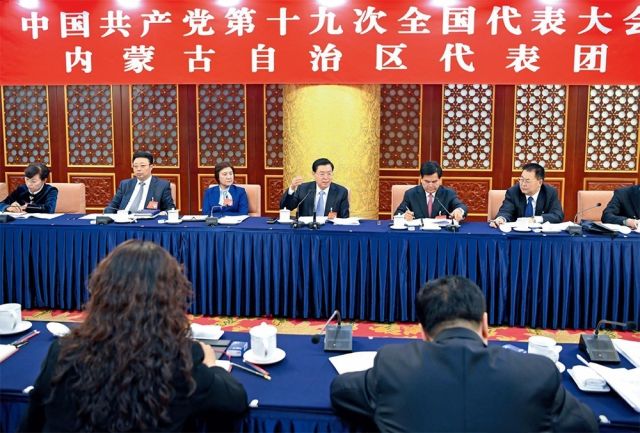 ▲10月18日,張德江參加黨的十九大內(nèi)蒙古自治區(qū)代表團(tuán)討論 張領(lǐng) 攝
