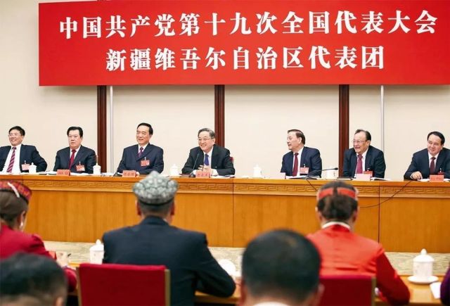 ▲10月18日,俞正聲參加黨的十九大新疆維吾爾自治區(qū)代表團(tuán)討論 謝環(huán)馳 攝