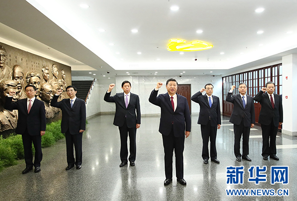 在上海中共一大會址紀念館,習近平帶領其他中共中央政治局常委同志一起重溫入黨誓詞。新華社記者 蘭紅光 攝