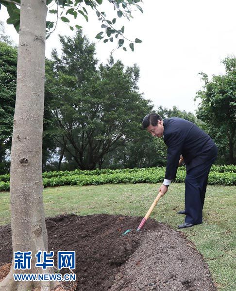 習近平在深圳蓮花山公園種下一棵高山榕樹。 新華社記者 蘭紅光 攝