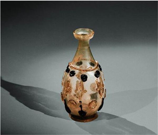 盤(pán)口細(xì)頸貼塑淡黃色琉璃瓶和羅馬丹芭紋描金藍(lán)色琉璃盤(pán),就是其中的兩件。