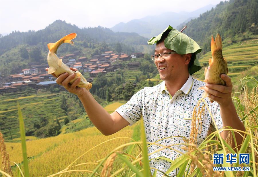 9月15日,在廣西融水苗族自治縣桿洞鄉(xiāng)花孖苗寨,游客展示參加捉魚比賽捉到的稻田魚。 9月15日,廣西柳州市融水苗族自治縣桿洞鄉(xiāng)花孖苗寨舉行2018金秋燒魚季活動(dòng),村民和游客共同開展水田拔河比賽、田間捉魚比賽和燒魚等活動(dòng)慶豐收。 新華社發(fā)(龍濤 攝)
