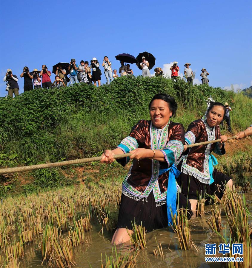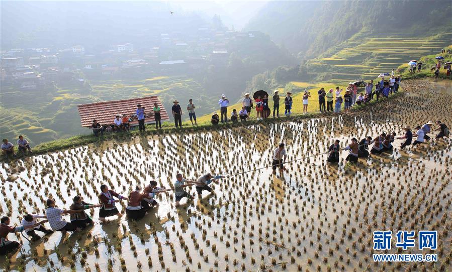 9月15日,在廣西融水苗族自治縣桿洞鄉(xiāng)花孖苗寨,人們?cè)趨⒓铀锇魏颖荣悺?nbsp;9月15日,廣西柳州市融水苗族自治縣桿洞鄉(xiāng)花孖苗寨舉行2018金秋燒魚季活動(dòng),村民和游客共同開展水田拔河比賽、田間捉魚比賽和燒魚等活動(dòng)慶豐收。 新華社發(fā)(龍濤 攝)