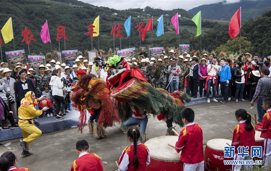 9月17日,人們?cè)诖蚬裙?jié)活動(dòng)上表演舞獅慶祝豐收。 新華社記者陶明攝