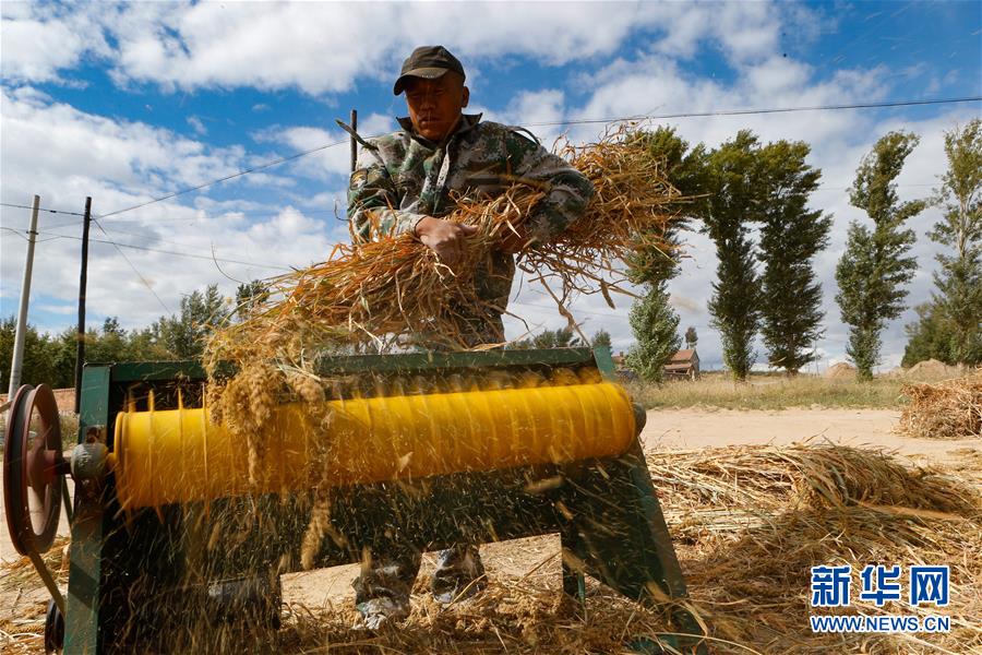 9月22日,敖漢旗北三家村村民給谷子脫粒。 新華社記者 虞東升 攝