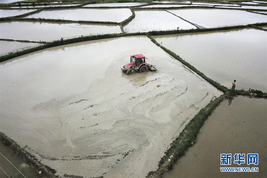 5月19日,在貴州省黔東南苗族侗族自治州錦屏縣敦寨鎮(zhèn)亮司村,村民在耕田(無人機拍攝)。 新華社發(fā)(彭澤良 攝)